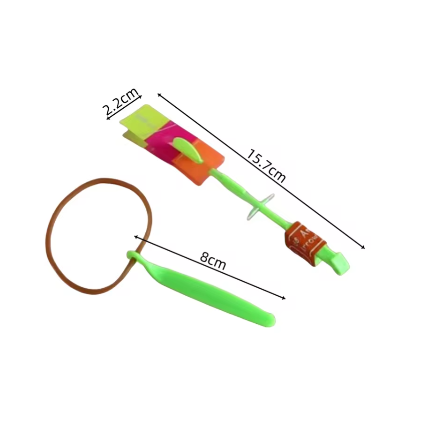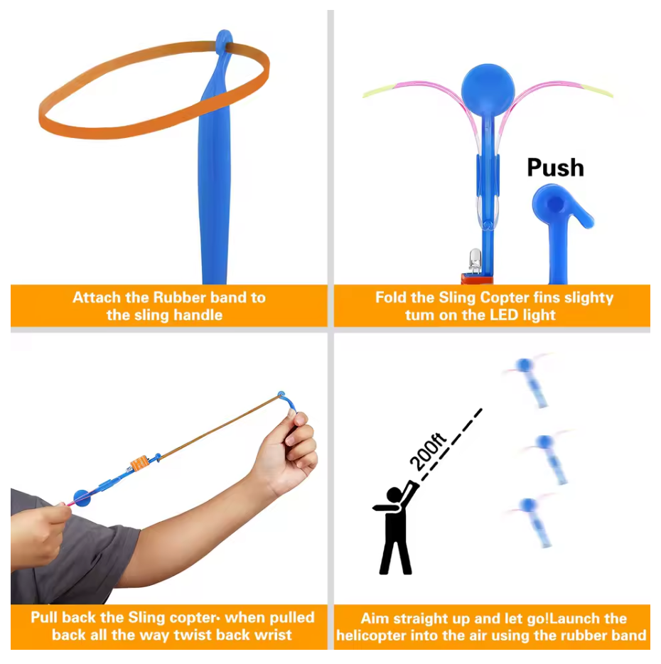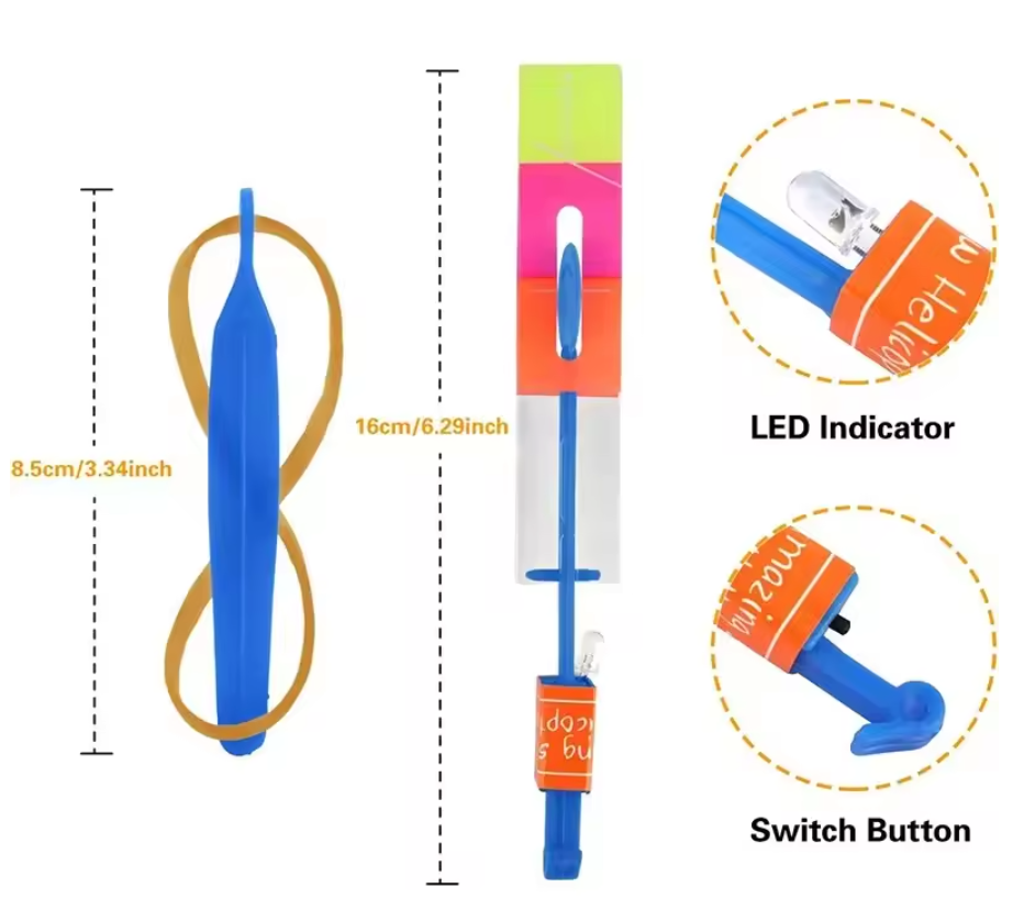 🚁🔦 LED Flying Toys Set - Get ready for takeoff by attaching the rubber band to the launcher handle and folding the rocket blades into spiral shapes. With a simple push of a button, the colorful LED lights come to life. Hook the helicopter toy to the rubber band, aim, and release! Remember, safety first - avoid shooting these captivating helicopters at people, animals, or fragile items. A quick check of the rubber bands ensures safe play every time.